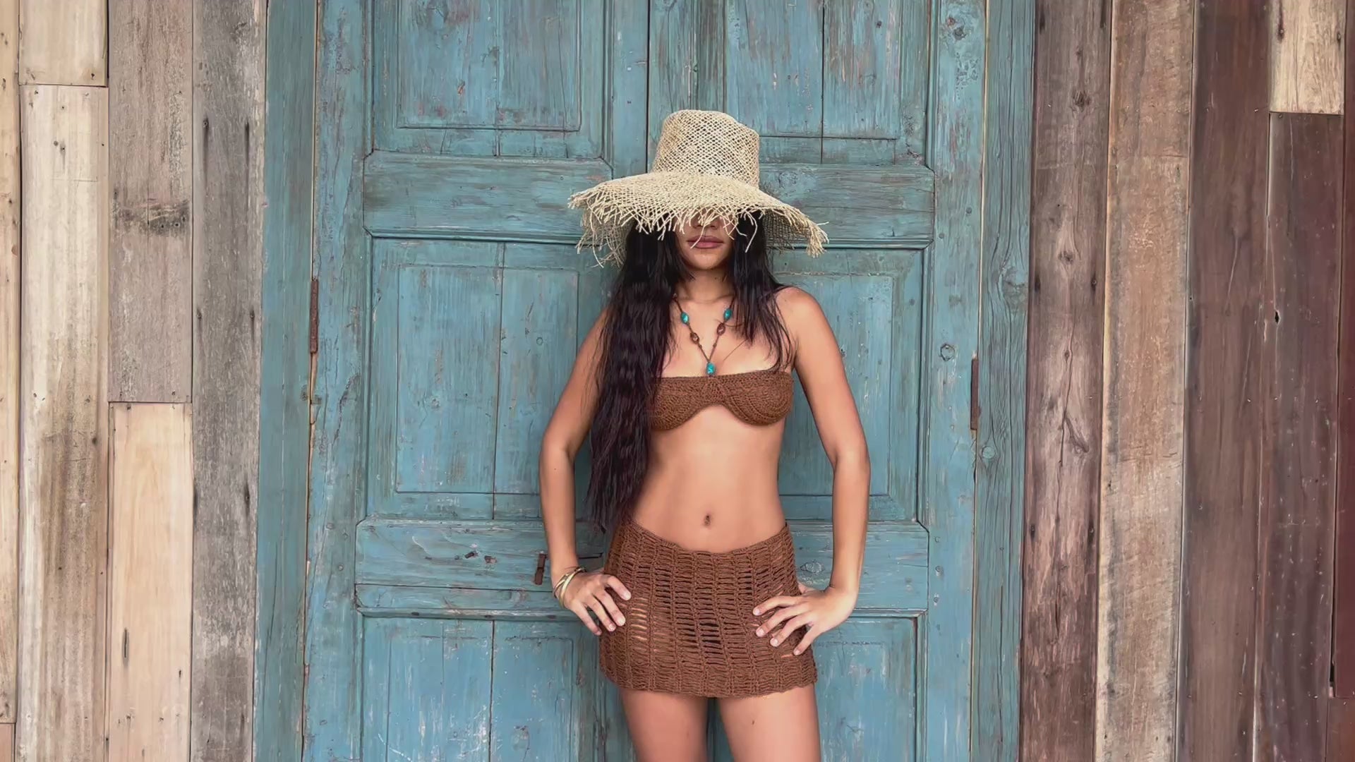 Ray ~ Our hand-crocheted set in a warm brown tone, detailed with small stone embellishments along the top and skirt.